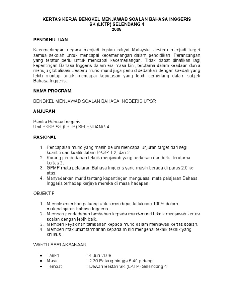 Contoh Kertas Kerja Bengkel Bahasa Melayu